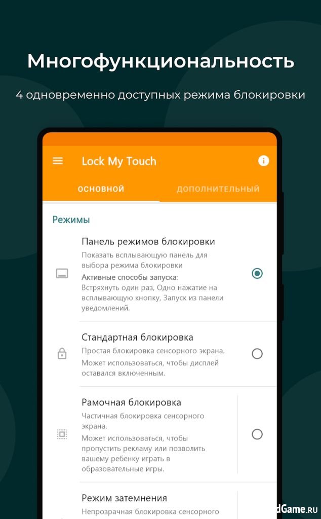 LockMyTouch разработан специально для того, чтобы предотвратить разблокировку экрана мобильного устройства при случайном нажатии на него. Зачастую случается так, что человек касается экрана при действиях, никак не связанных с управлением телефоном. Это приводит к закрытию приложений или запущенных программ. Но теперь об этом можно забыть. Дисплей останется активным, но разблокировать экран можно будет только целенаправленным, изначально заданным действием. К примеру, включив ребенку мультфильм на телефоне, вы спокойно сможете заниматься другими делами, ведь малыш не сможет запустить другие программы. И это лишь один пример того, в какой ситуации можно применить данную программу. Калибруйте различные настройки системы, добиваясь необходимого результата. Виртуальный наставник поможет разобраться во всех нюансах, подробно описав каждый процесс так, что у пользователя не останется вопросов.