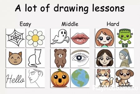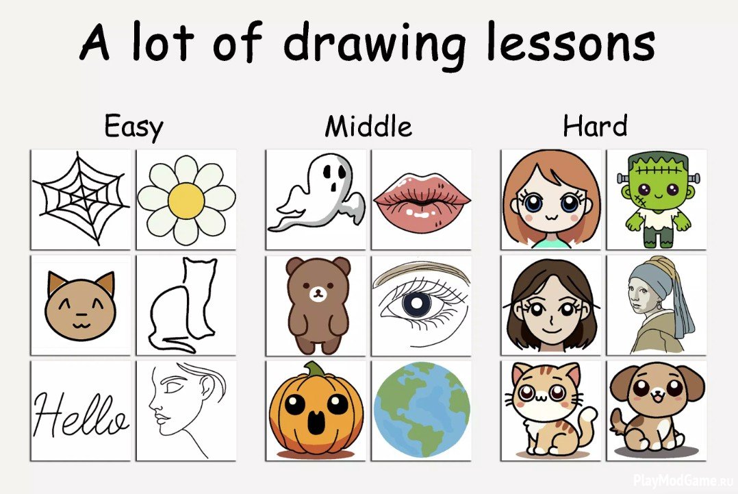 Рисовать здесь можно практически все, так как в число категорий входят «животные», «аниме», «части тела», «геометрические фигуры» и т.д. Для каждой категории предусмотрены уникальные уроки, призванные помочь освоить разные стили.