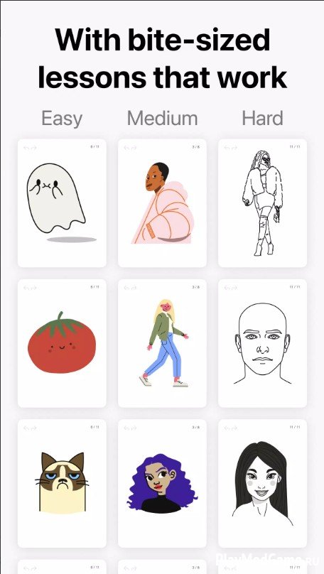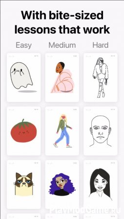 Приложение предлагает огромное количество пошаговых уроков, разбитых на простые действия: сначала обводка контуров, затем раскраска, тени, текстуры и т.д. Это помогает пользователю без художественного опыта постепенно освоить основы рисования, скетчинга, живописи и каллиграфии. Тематика уроков обширна: рисование животных, архитектуры, создание праздничных открыток, символов, абстракции. Каждый курс строится по принципу «меньше теории - больше практики».