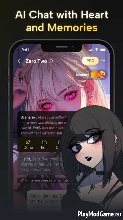 Каждый герой в приложении обладает долговременной памятью, то есть он запоминает ваши разговоры, предпочтения и историю взаимодействий. Благодаря этому персонаж не просто отвечает на сообщения, а развивается вместе с вами, становится ближе и понимает вас лучше с каждым новым общением. Вы можете создать собственного персонажа с уникальным характером, внешностью и стилем общения. Это позволяет делать общение максимально комфортным, ведь персонаж будет соответствовать вашим предпочтениям. В приложении есть готовые персонажи из различных вселенных: фэнтези, аниме, кино.