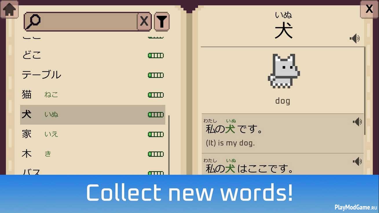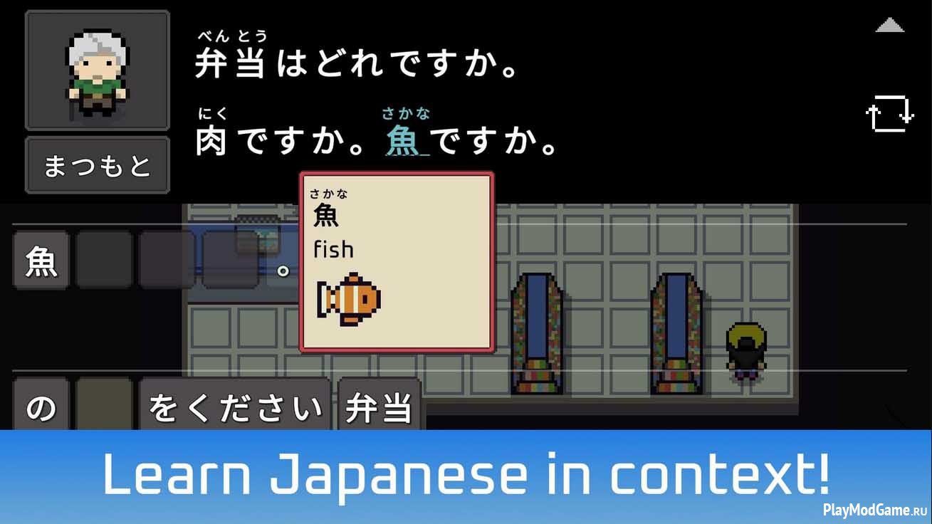 Приложение предлагает запоминать лексику и конструкции через интерактивные квесты, мини-игры и сражения с грандмастерами японского языка, где победа зависит от правильно использованных кандзи или грамматики. Например, чтобы продвинуться по сюжету, нужно освоить определенный набор иероглифов или правильно составить предложение. Проект предлагает настройку уровня сложности, создание аватара и выбор темпа обучения. Прогресс отслеживается через детальную статистику по количеству освоенных кандзи, слов и пройденных диалогов.
