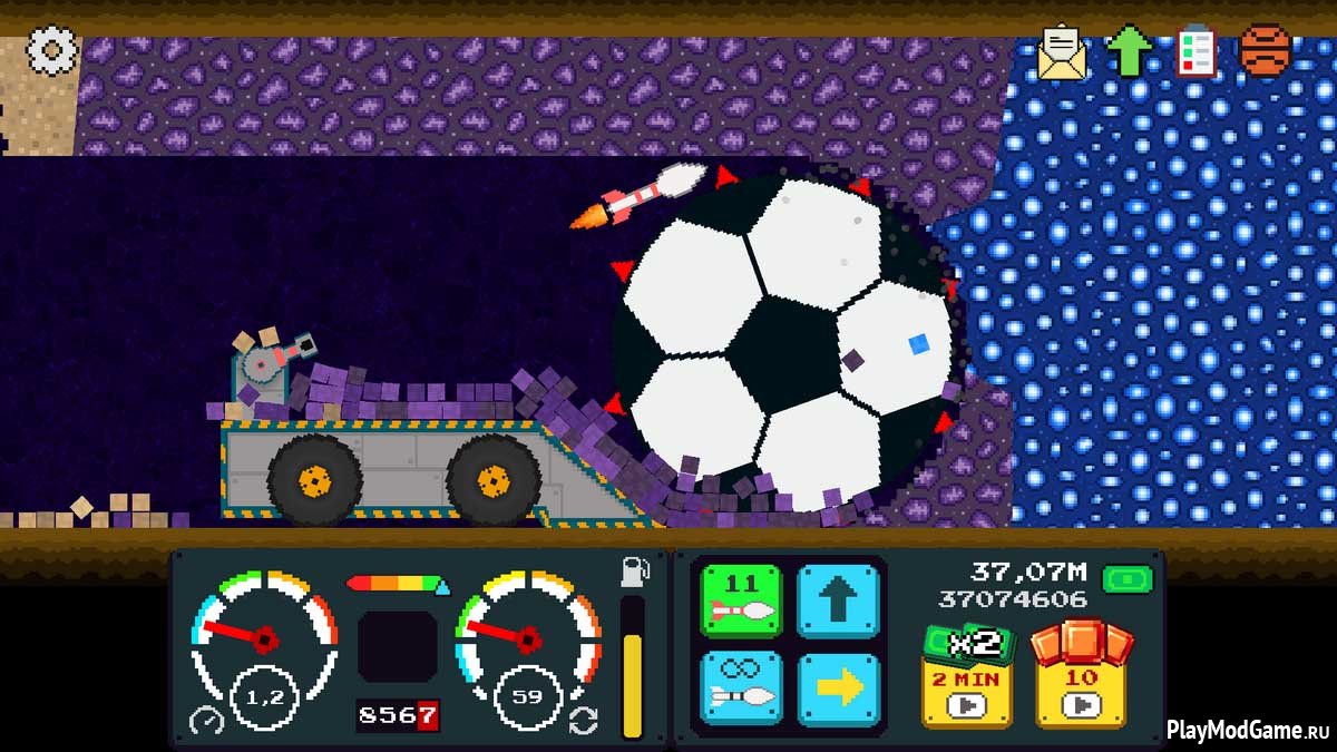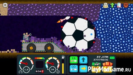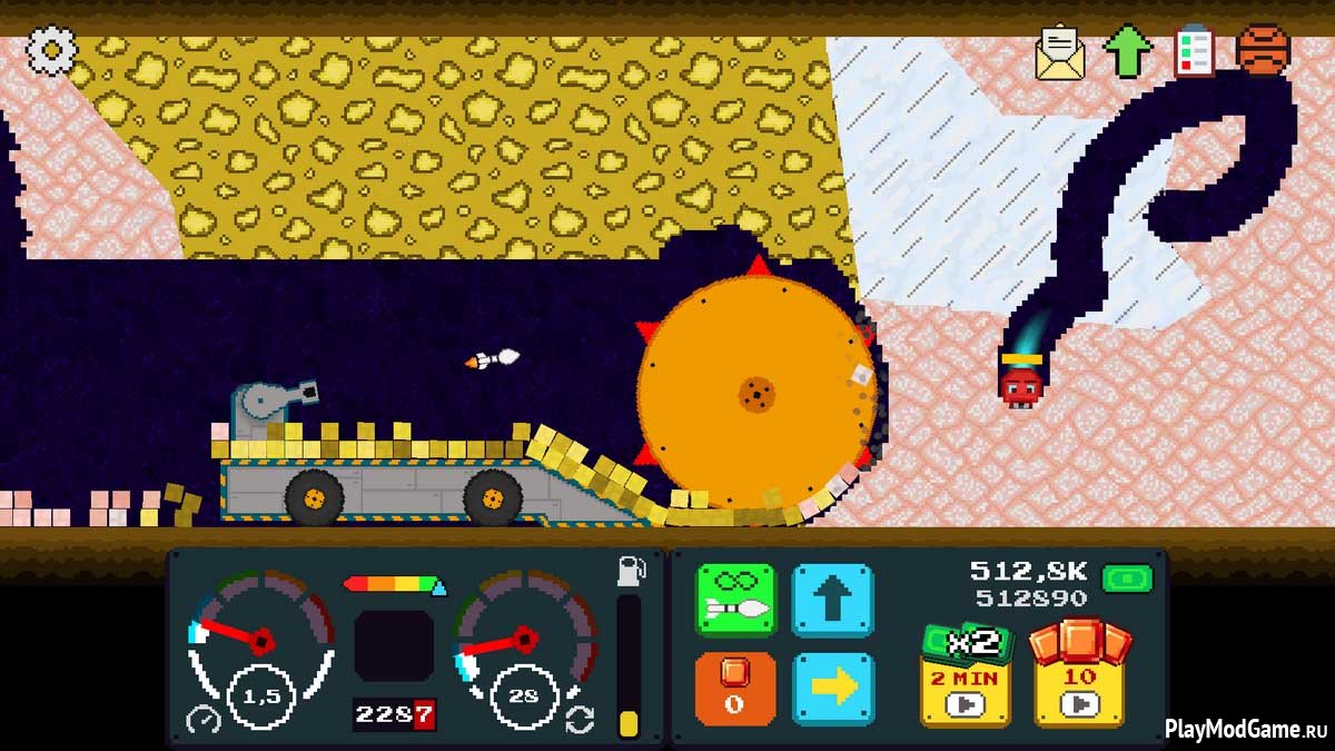 Буровая машина представляет собой довольно серьезную конструкцию, которая имеет на вооружении огромный бур, конвейер и даже ракетницу! Подбирайте наиболее эффективную траекторию, чтобы за один залп обрушить как можно больший участок. Не забывайте следить за уровнем топлива.