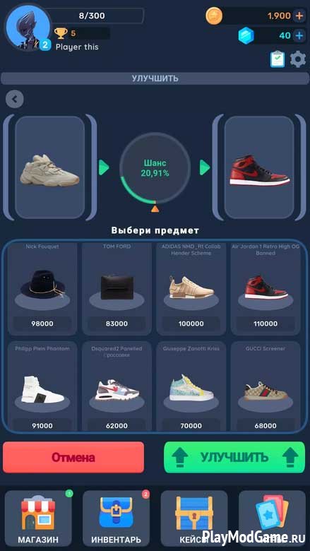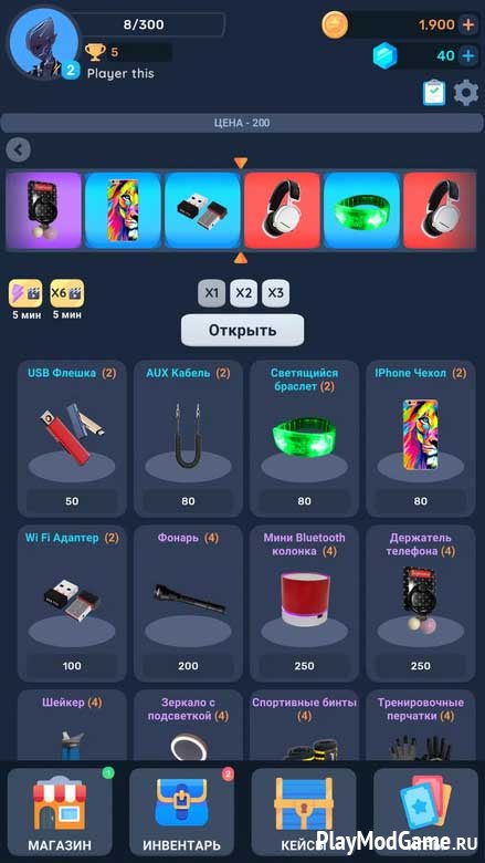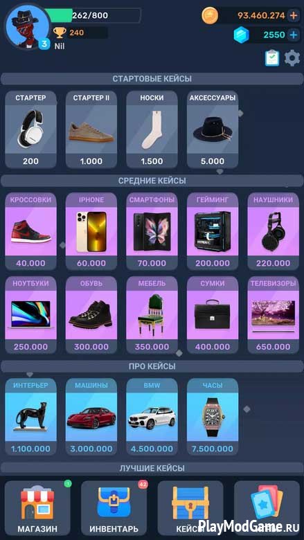 TapCase - Кейс Симулятор дает возможность пользователю собрать уникальные вещи – коллекции: от носков и ботинок до машин и самолетов! Ежедневные бонусы и задания позволяют как приобрести новую карточку – предмет, так и получить средства для дальнейшего улучшения предмета. Дополнительный мод позволяет увеличить количество получаемых денежных средств для того, чтобы пользователь мог совершенствовать свои коллекции или аватарки. Если карточка – предмет не относится к коллекциям, ее можно продать, чтобы получить больше денег для покупки новых кейсов. Все карточки на продажу удобно распределены в инвентаре по стоимости. Таким образом, пользователь сможет продать ненужный предмет с максимально высокой ценой, чтобы не остаться в накладе. Отдельно стоит отметить, что изображения всех предметов максимально реалистичны, что создает иллюзию «приобретения» определенного предмета (даже если это самолет, пароход или эксклюзивные модели машин). Также есть возможность улучшить предметы, чтобы получить в коллекцию (или на продажу) более статусный предмет.