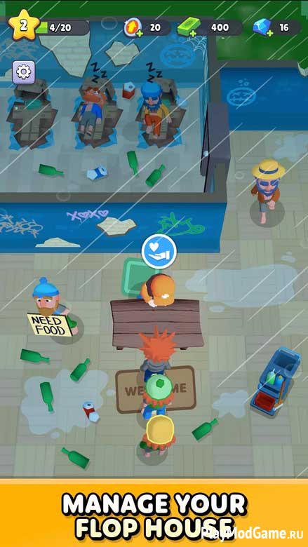 Flop House погружает пользователя в интересный и малоизученный мир организации помощи бездомным людям. Главный нюанс – пользователь выступает в качестве владельца приюта для тех, кто лишился жилья. И ему придется соблюдать баланс между бизнес – развитием и человеческим сочувствием нуждающимся. Игра начинается с того, что пользователю необходимо построить и начать минимально улучшать приют. Здесь стоит помнит главное: чем лучше будет приют, тем больше будет постояльцев и прибыли. Из-за этого необходимо постоянно отслеживать количество персонала, качество его обучения. Ведь самостоятельно будет практически нереально уследить за всем: от уборки до обеспечения необходимыми жизненно важными предметами новых постояльцев или решать возникающие проблемы. Поэтому, за данным параметром необходимо следить, так как от него будет зависеть удовлетворённость клиентов, скорость решения проблем, быстрота обеспечения и получение дополнительной прибыли. Отдельно стоит выделить регулярные игровые события: на них можно получить уникальные награды, позволяющие быстрее развивать приют, обучать персонал и обеспечивать клиентов всем необходимым.